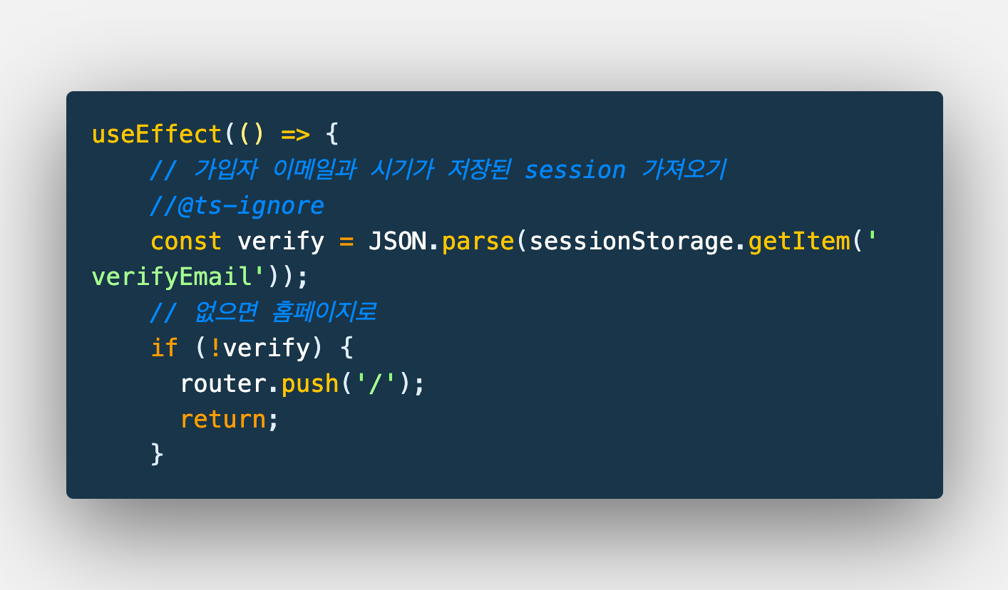 useEffect내에서 세션스토리지에서 해당 메일과 시간을 가져오고 없으면 홈페이지로 보낸다.
