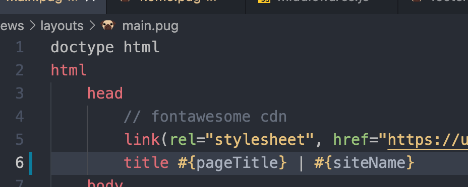main.pug에 siteName 앞에 이페이지의 타이틀을 나타낼 #{pageTitle} 변수를 작성해주자.