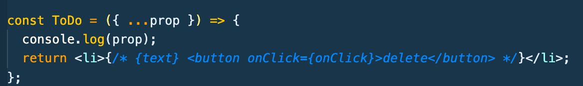 <ToDo todo={todo} /> 요렇게 되겠다. 이렇게 todo가 넘어가고 destructure로 {text}만 받는 구조.