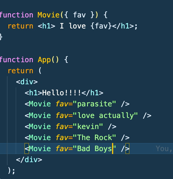 이제 fucntion Movie( { fav } ) {... 라고 오브젝트의 키값을 넣어주고 리턴 하는 태그의 텍스트를