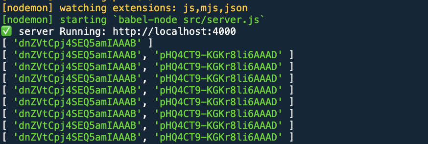 setInterval 함수를 이용해 2초마다 socket.id를 가진 배열을 출력하도록 했다 . 현재 두개의 창에서 접속해있어서 이렇게 두개가 뜬다.