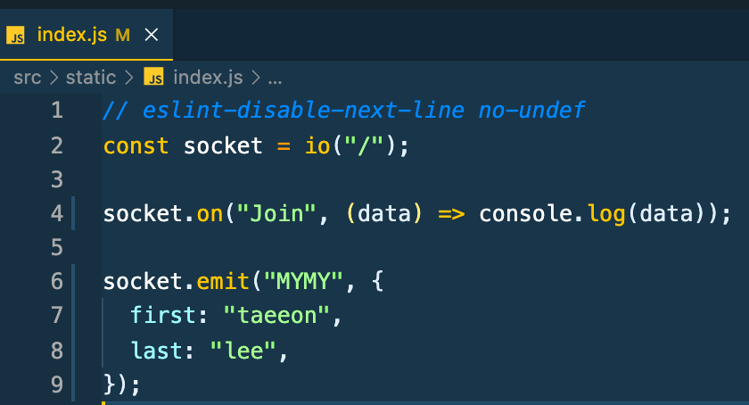 그리고 프론트 파일인 index.js에 io("/") 를 실행하도록 해주면.