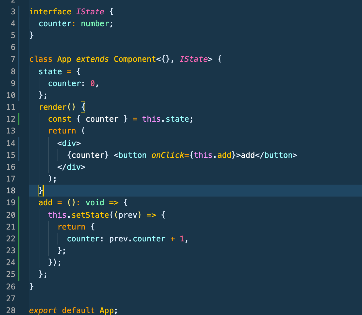 state의 구조를 미리 선언하고 컴포넌트에 이를 알려준다. 그래야만 타입스크립트로 리액트를 진행할때 컴포넌트가 state의 타입에 대해 알 수 있다. 그리고 add함수를 보면 옆에 void라고 선언이 되어있는데~ return값의 타입에 대해 선언해준것이다.