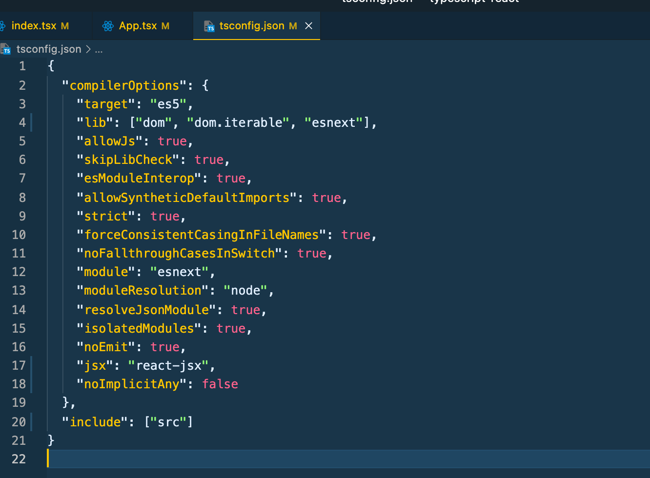 tsconfig파일도 있다. 여기서 하나 추가해줬는데 noImplicitAny:false 이부분이다.