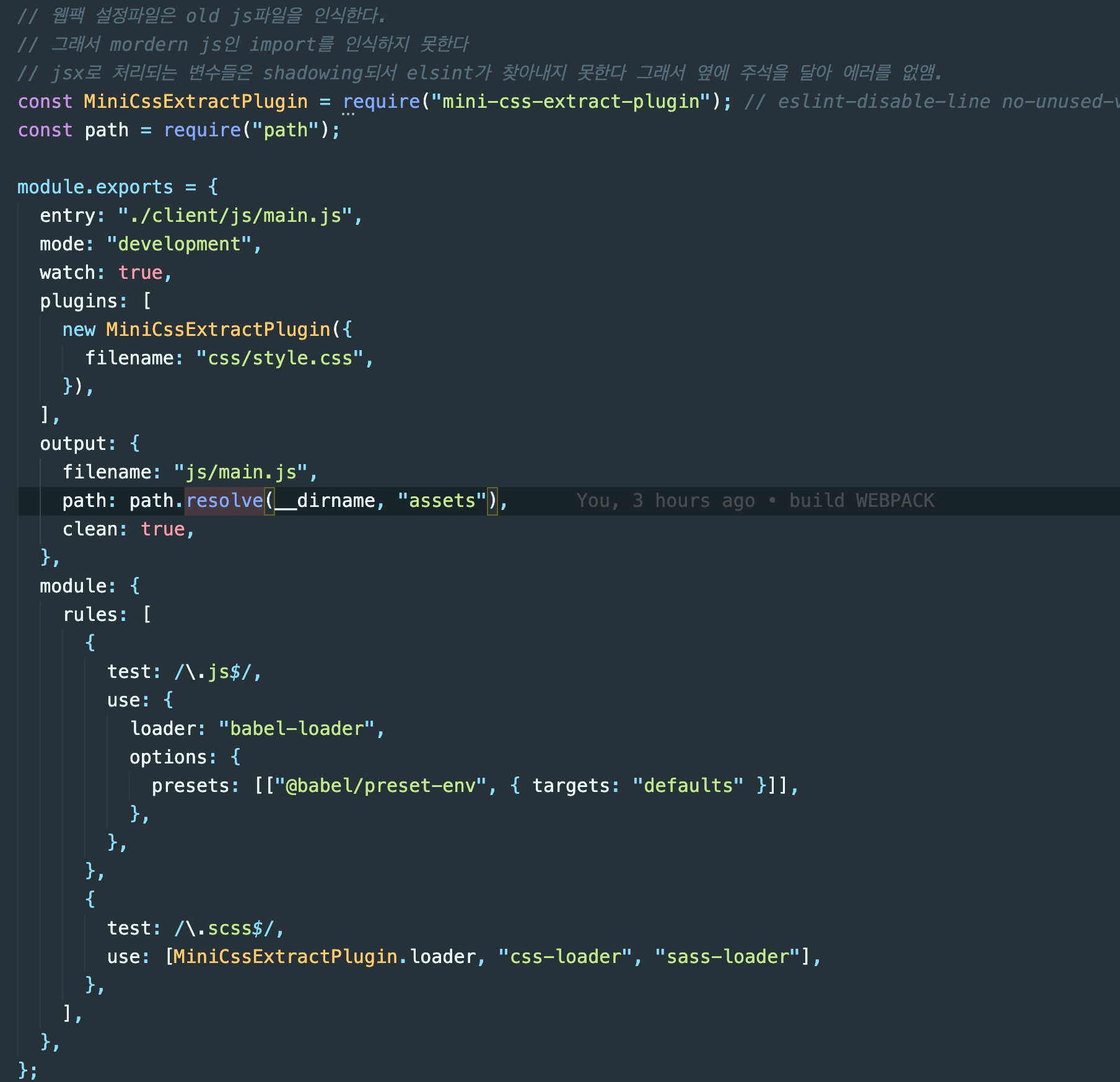 먼저 경로를 파악하는 path 모듈을 import해주고( webpack은 old js파일을 인식하기에 require를 사용)