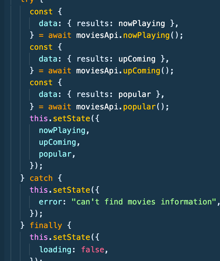 try구문에서는 moviesApi를 import해주고 moviesApi에 nowplaying을 async await을 활용해 받아오고