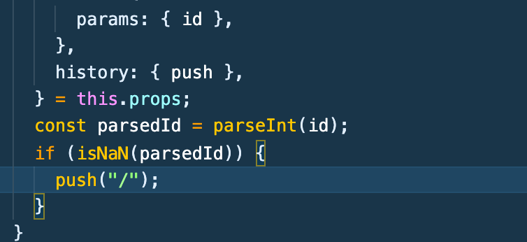 location에 push 메소드를 넣어주고 조건문으로 parsedId가 isNaN이면 홈으로 ㄱ ㄱ ㄱ