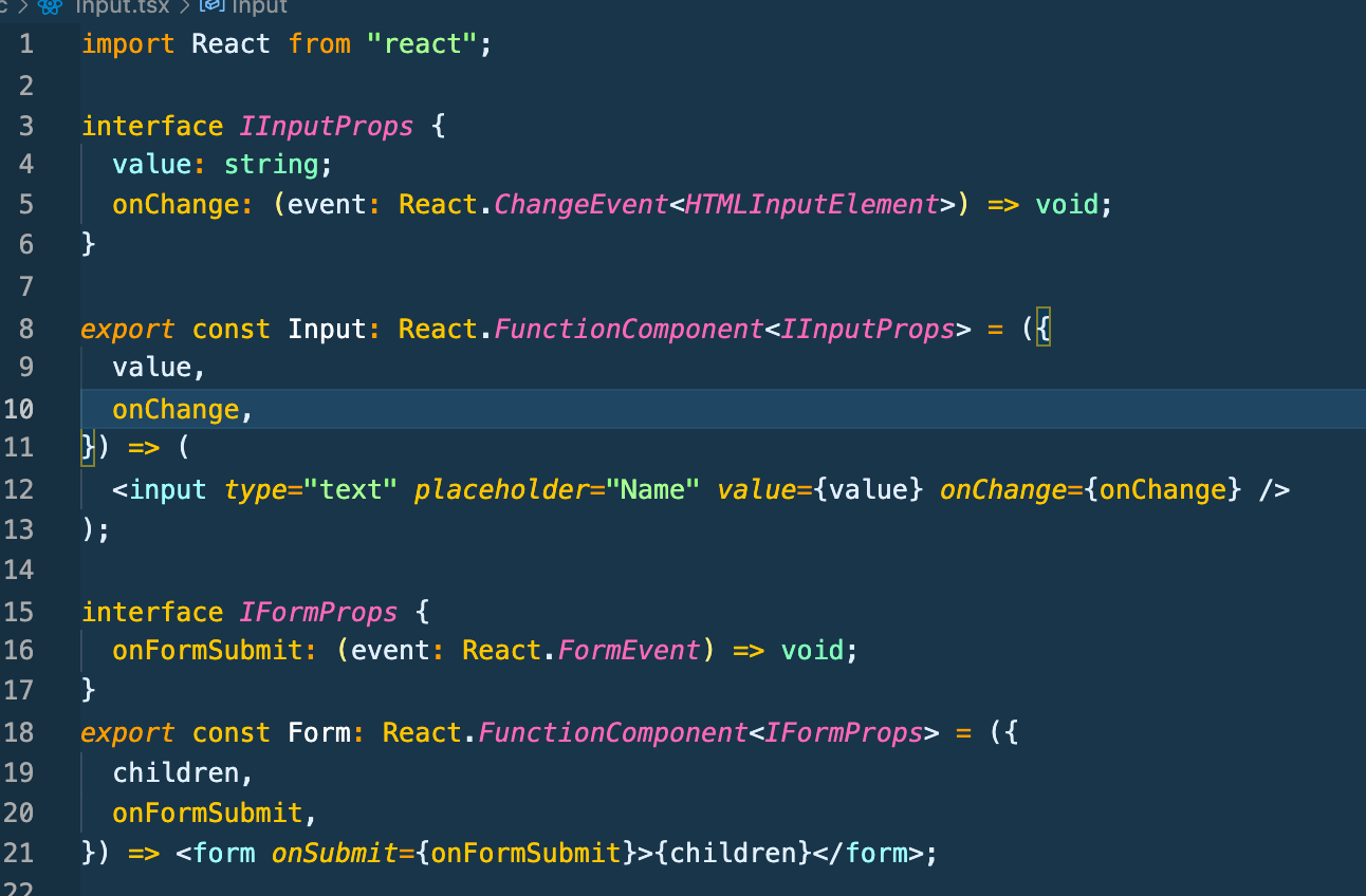 두개 다 interface로 props의 type을 결정해주고 각각의 컴포넌트가 React.FunctionComponent임을 명시해준다. 그리고 작성한 interface를 전달해준다. 음 심도있게 더 공부해야겠지만 받아들이자 ㅎㅎ;; 일단 props에서 전달받은 onChange함수와 onFormSubmit함수의 타입을 void로 선언하는데 역시 event: React.~~~~ 를 작성해서 event타입도 확인해줘야 한다.