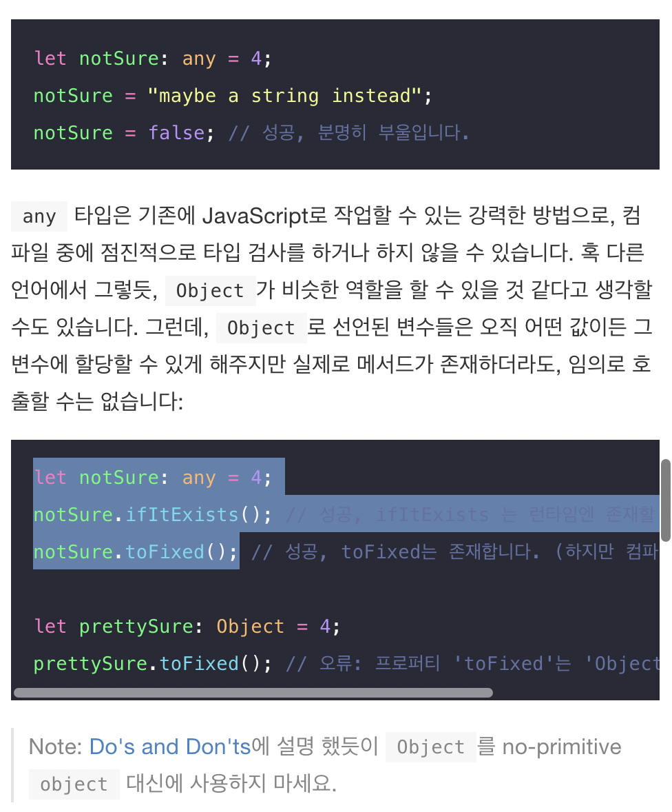 이 경우 타입 검사를 하지 않고 그 값들이 컴파일 시 함께 컴파일되길 원할 때 any타입을 사용 할 수 있다.