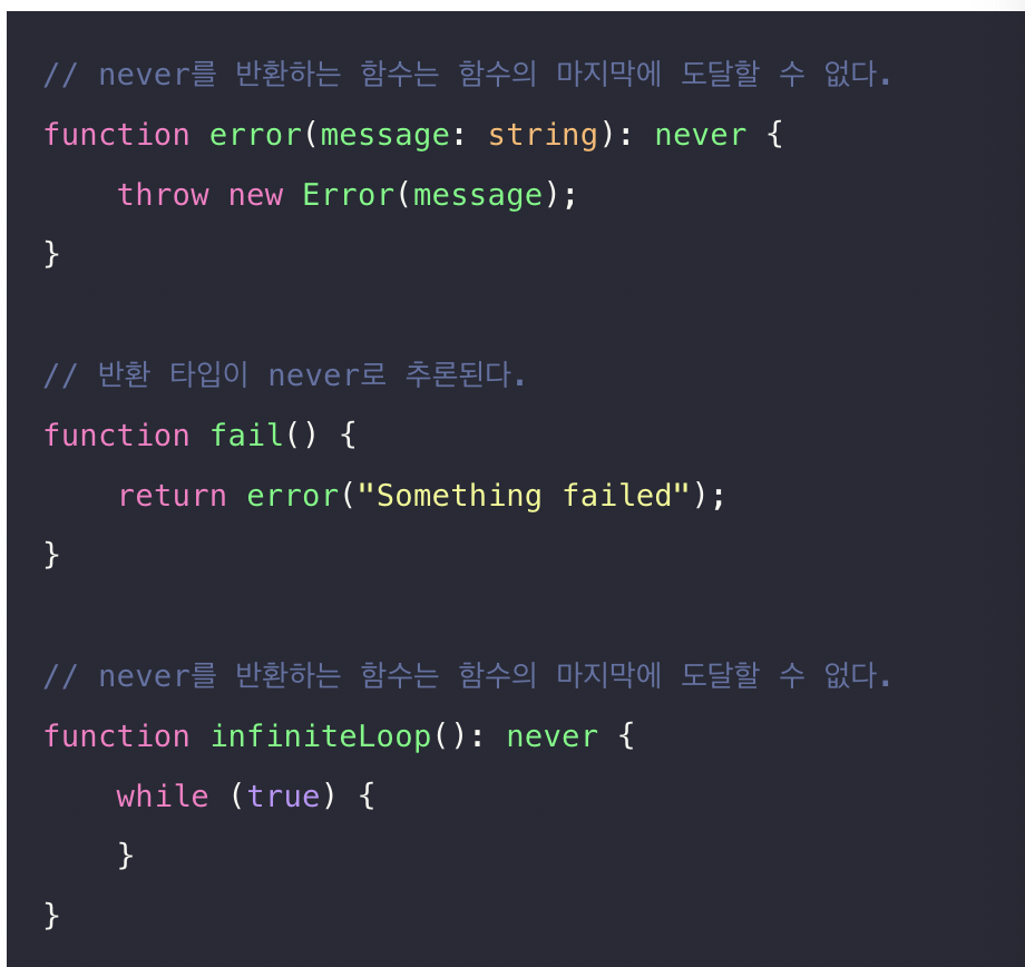 예로 never는 함수표현식이나 화살표 함수 표현식에서 항상 오류를 발생시키거나 절대 반환하지 않는 반환 타입으로 쓰인다.