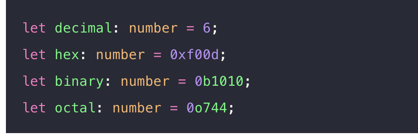 마찬가지다. 일단 자바스크립트 처럼 모두 부동 소수 값이다. typescropt는 16진수, 10진수 리터럴에 더불어