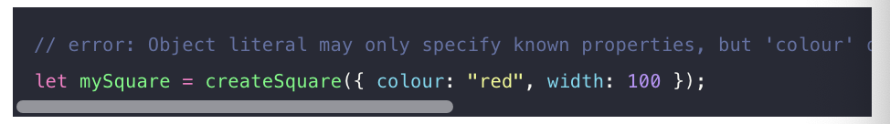 당연한 말인듯 만약 {colour: "red}만 arg로 전달된다면 interface에 매칭되는 것이 없기에 에러가 나는게 당연하다.