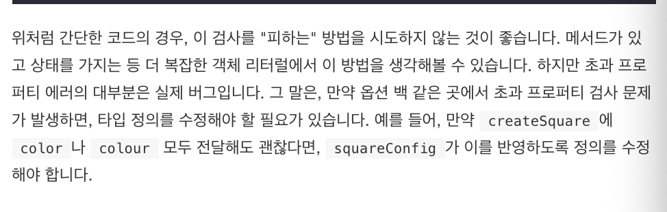 but 타입스크립트는 이 코드에 버그가 있을 수 있다고 받아들인다. 객체 리터럴은 다른 변수에 할당할 때나 인수로 전달할 때 특별한 처리를 받고서 excess property checks를 거친다.