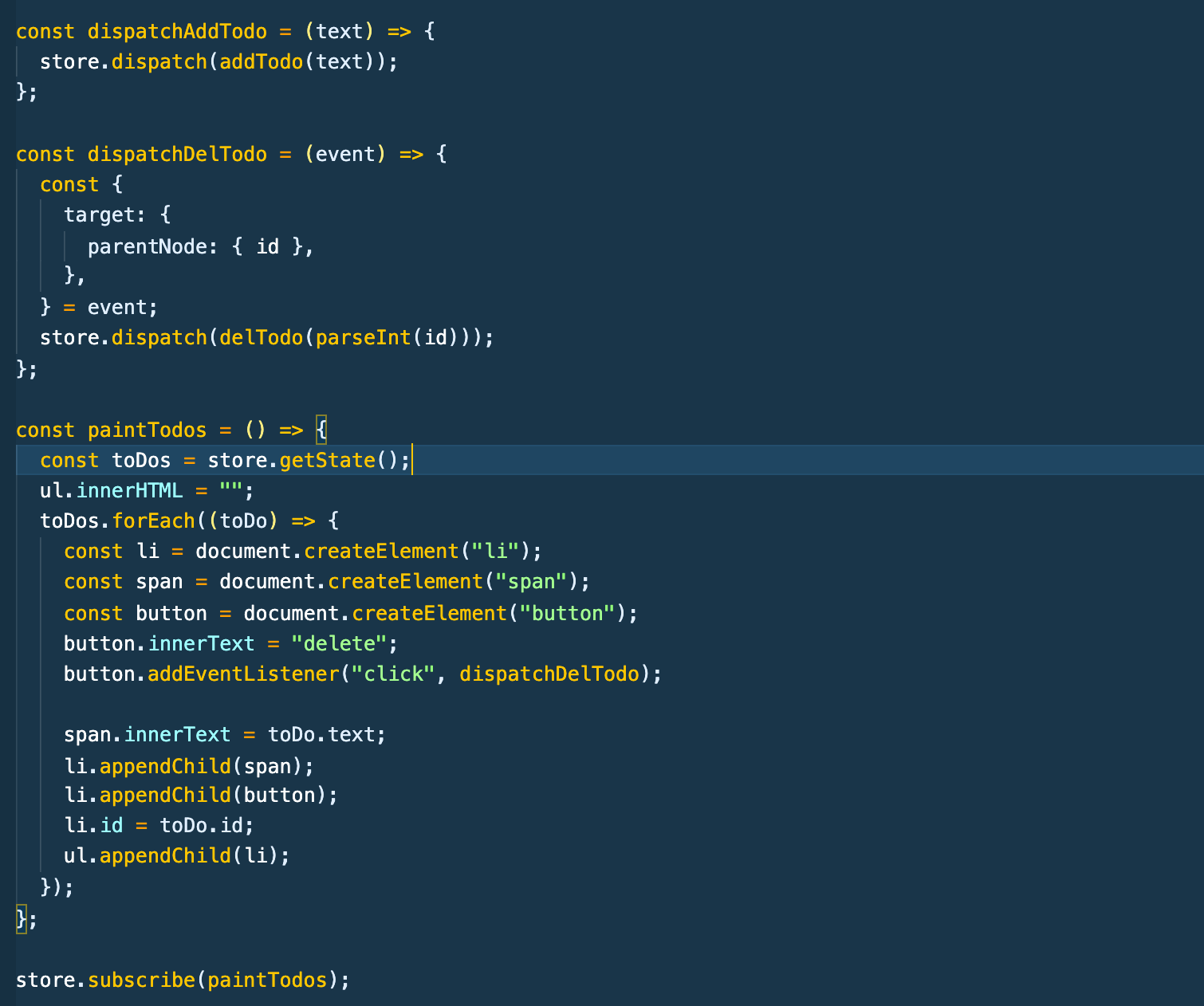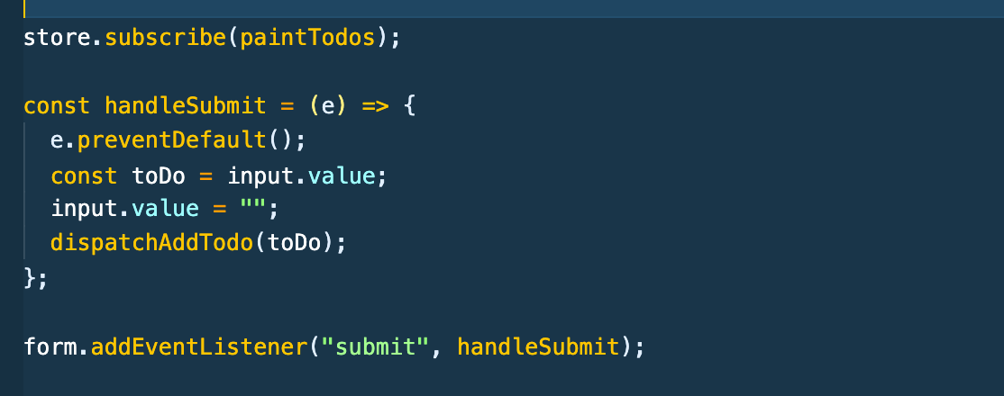그리고 subscribe메서드를 통해 이 paintTodos를 실행해준다. subscribe는 말그대로 구독이다. store를 구독하고 있는 것이다.