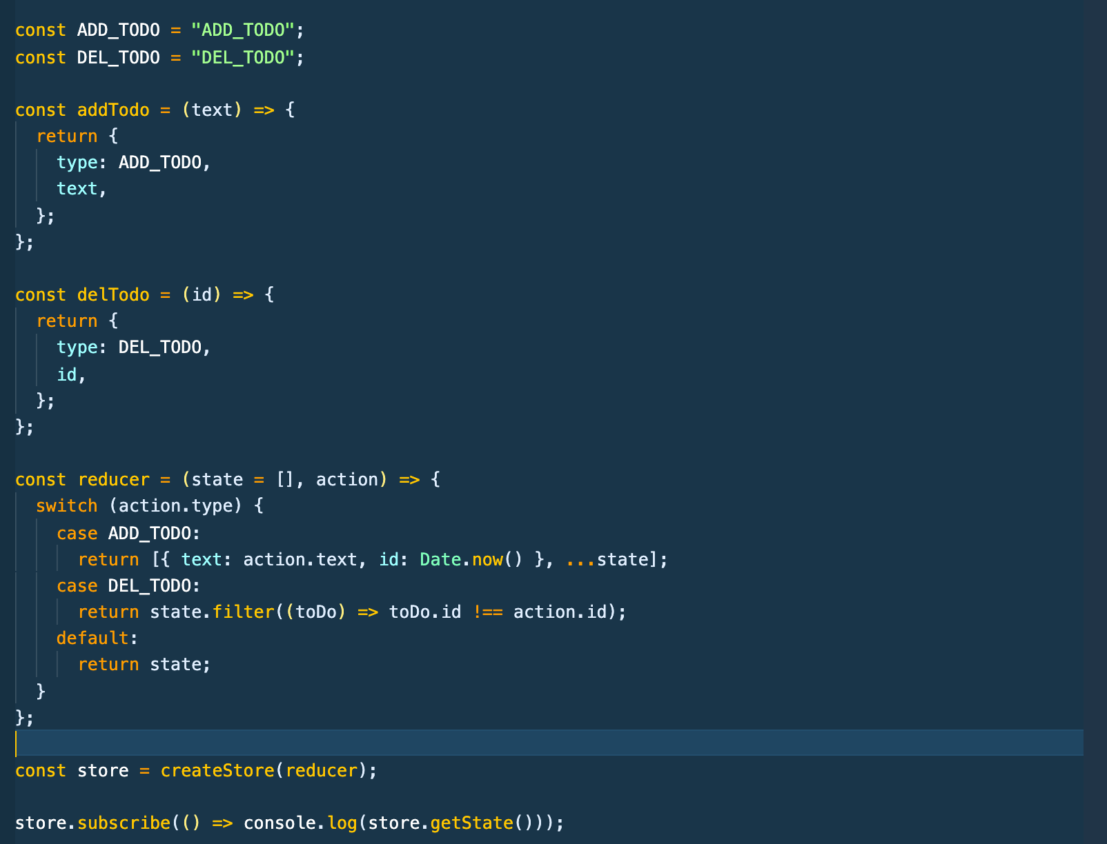 그리고 역시 reducer를 만들어주는데 이때 파라미터는 state라는 배열과 , action을 전달한다.